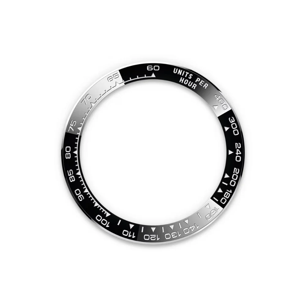 - Bezel: Black monobloc Cerachrom in ceramic with platinum-coated tachymetric scale